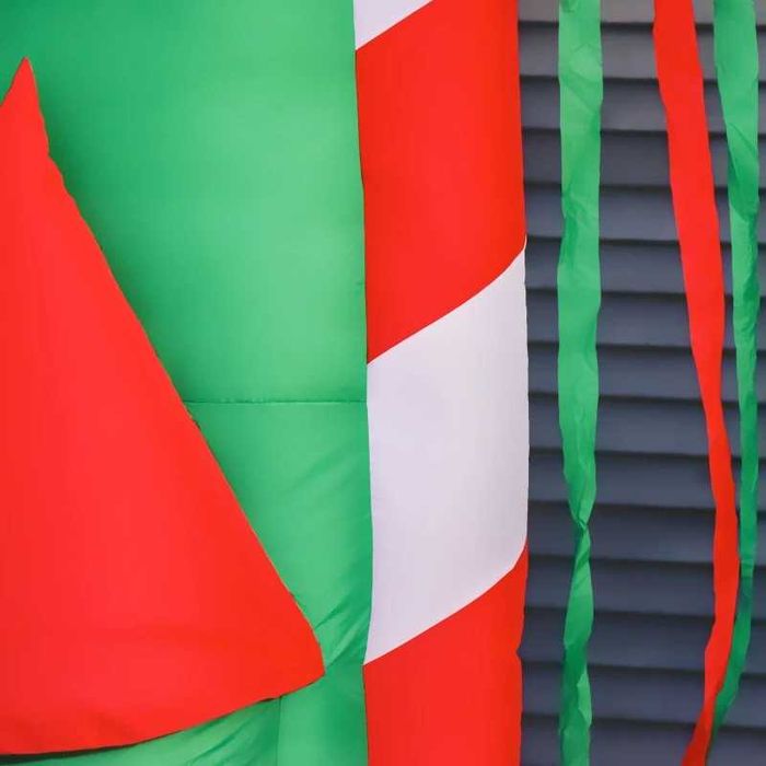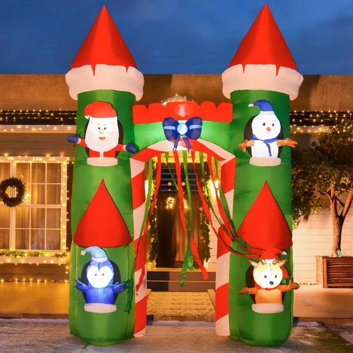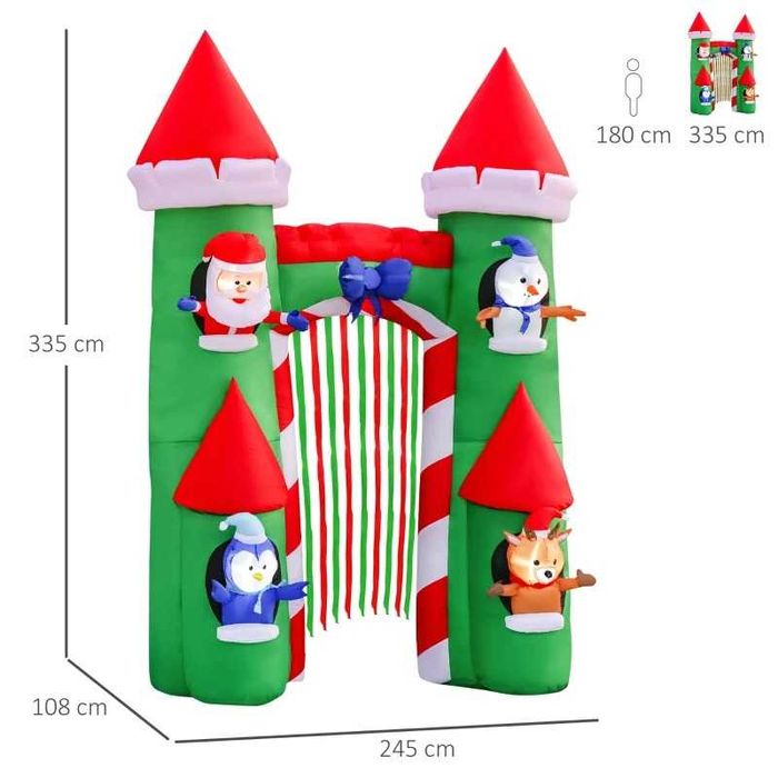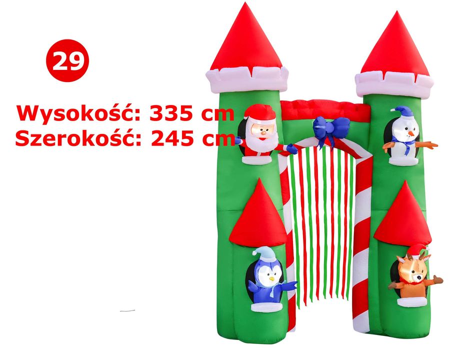 Świąteczna dekoracja do ogródka - dmuchana Brama Bożonarodzeniowa. Wysokość ozdoby wynosi 335 cm, od środka jest oświetlona białymi lampkami LED. Ozdoba jest wykonana z przewiewnego materiału, dlatego musi być cały czas podłączona do zasilania, posiada wbudowaną pompkę.