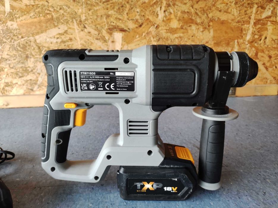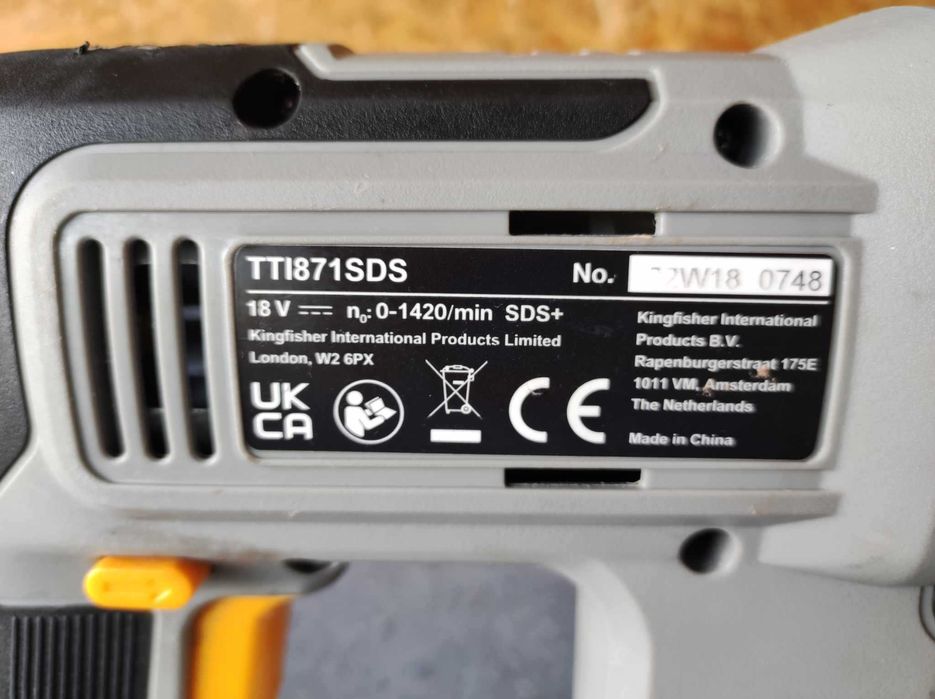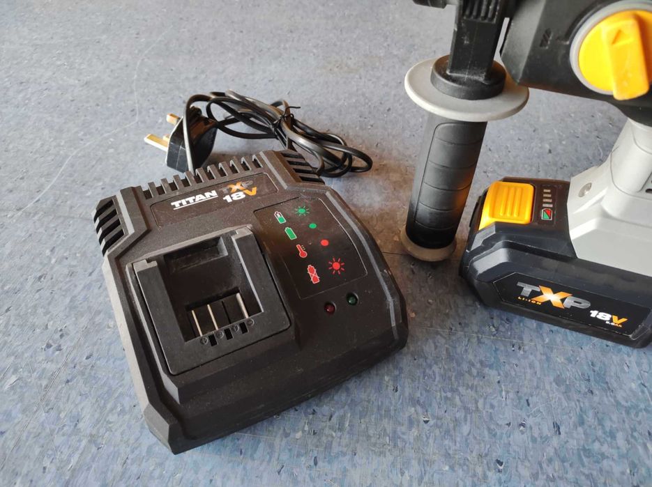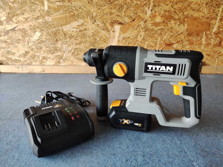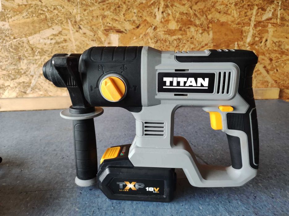 Młotowiertarka akumulatorowa firmy Titan model TTI871SDS w zestawie z akumulatorem 18V 5Ah oraz ładowarką. Wiertarka została wyposażona w uchwyt SDS Plus. Ładowarka posiada wtyczkę sieciową angielską (gratis przejściówka).
