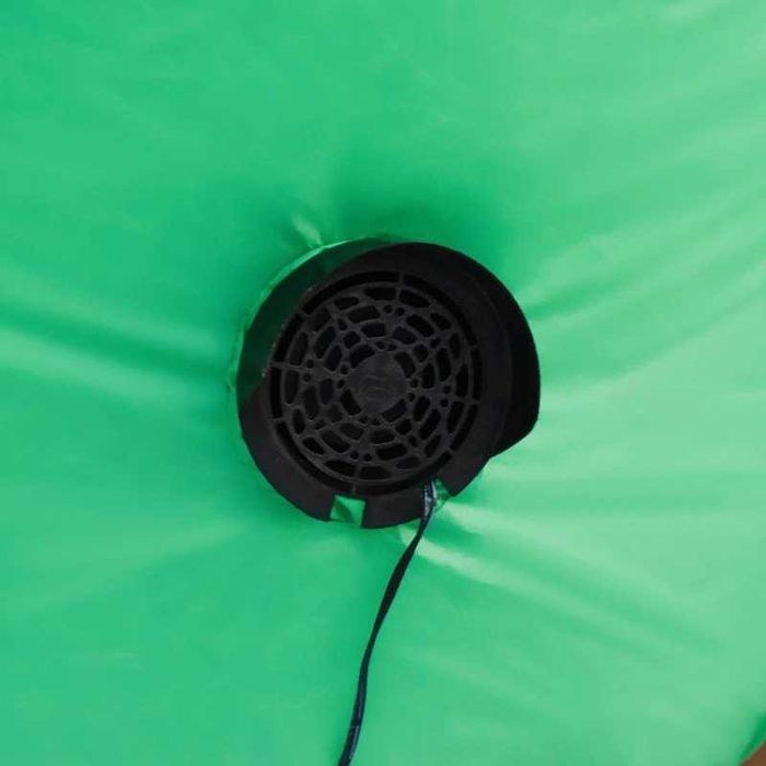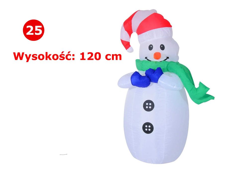 Świąteczna dekoracja do ogródka - dmuchany Bałwan. Wysokość ozdoby wynosi 120 cm, od środka jest oświetlona białymi lampkami LED. Ozdoba jest wykonana z przewiewnego materiału, dlatego musi być cały czas podłączona do zasilania, posiada wbudowaną pompkę.
