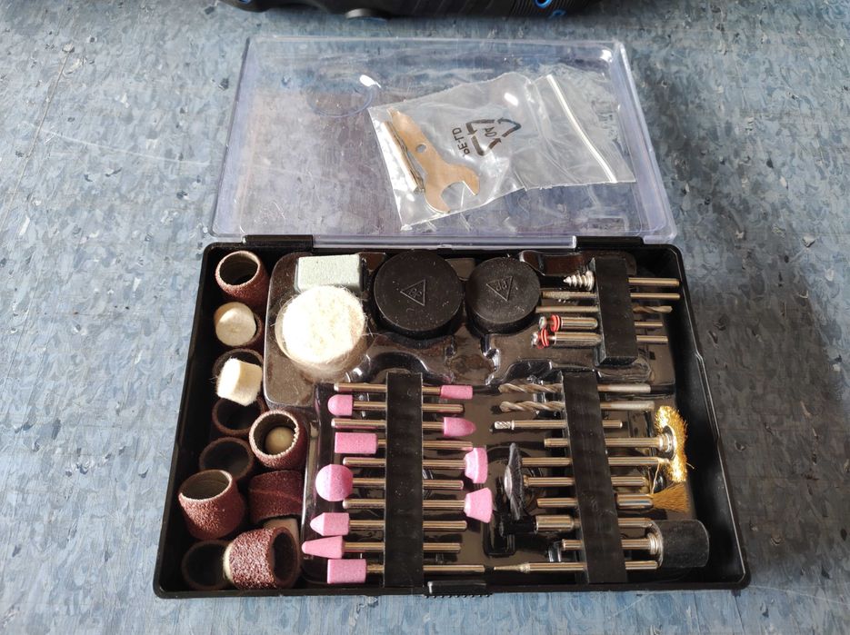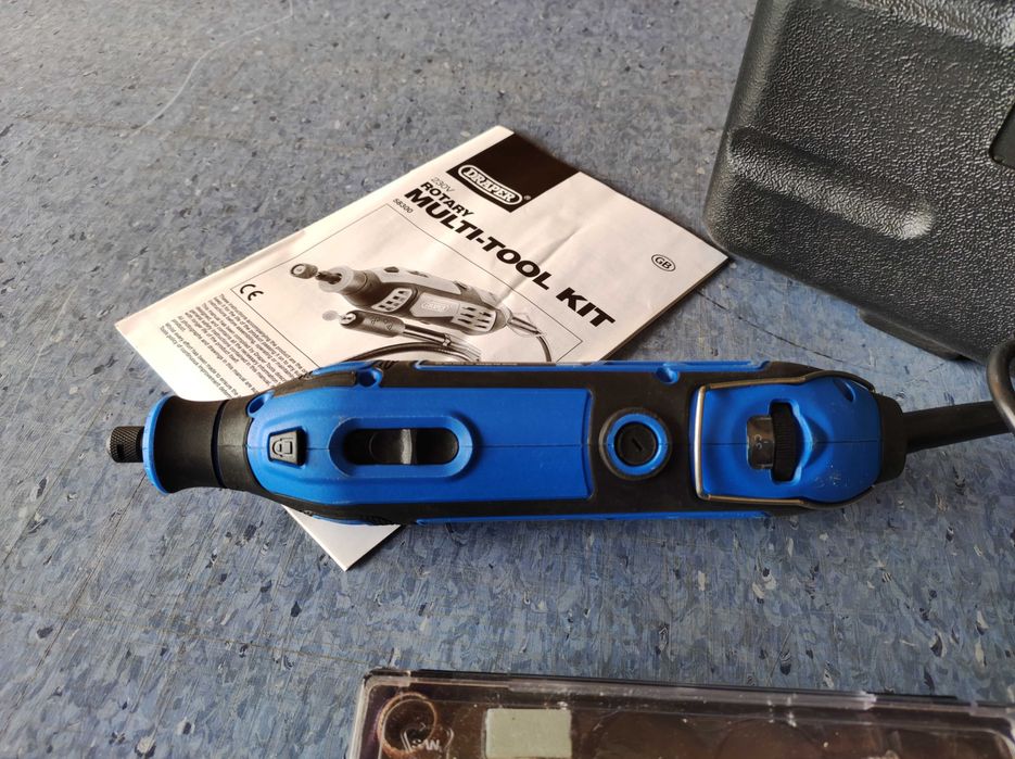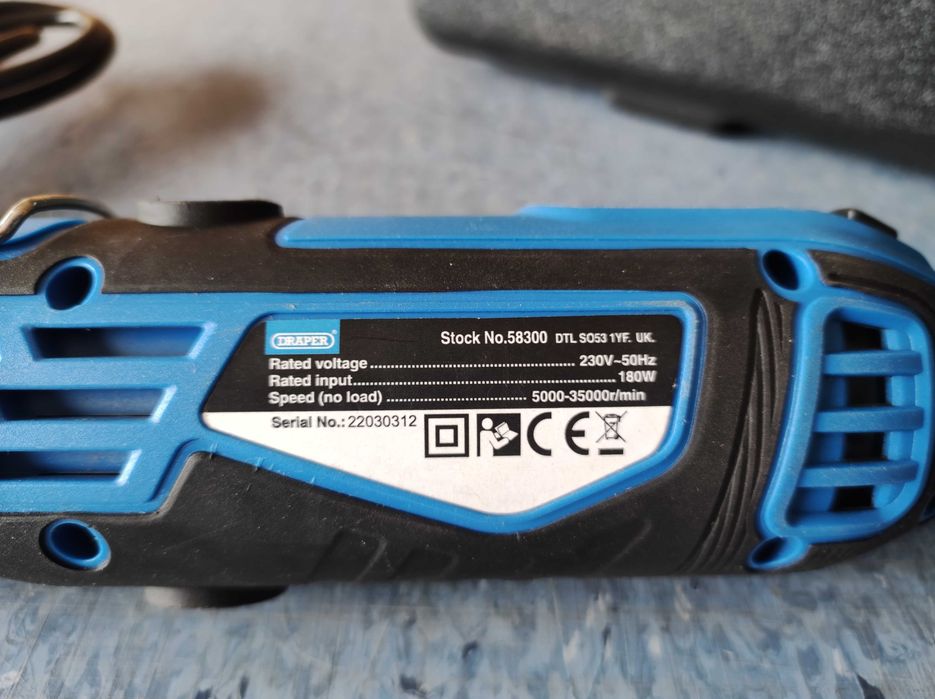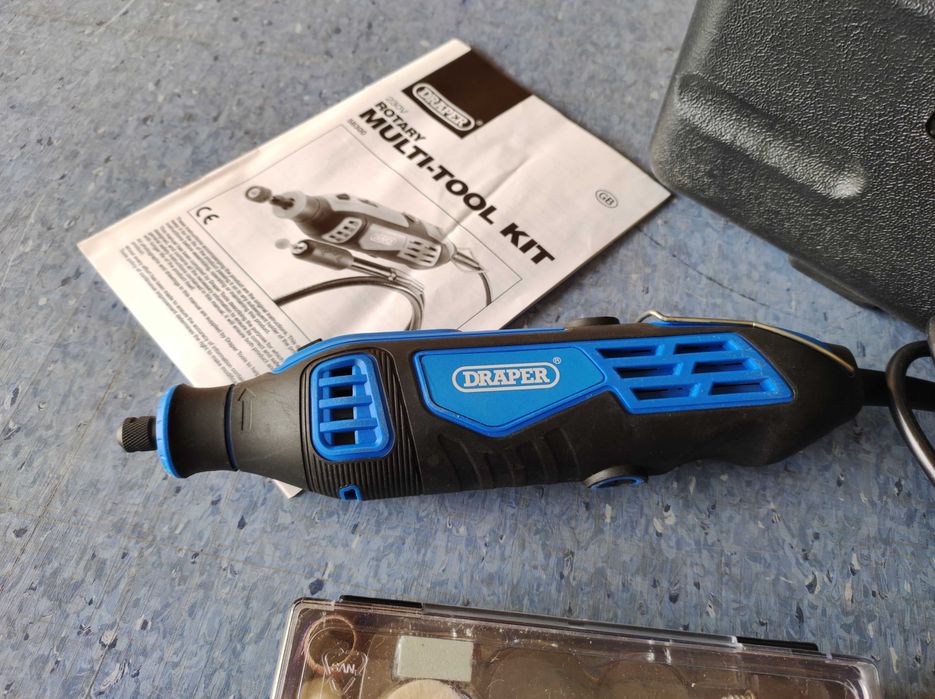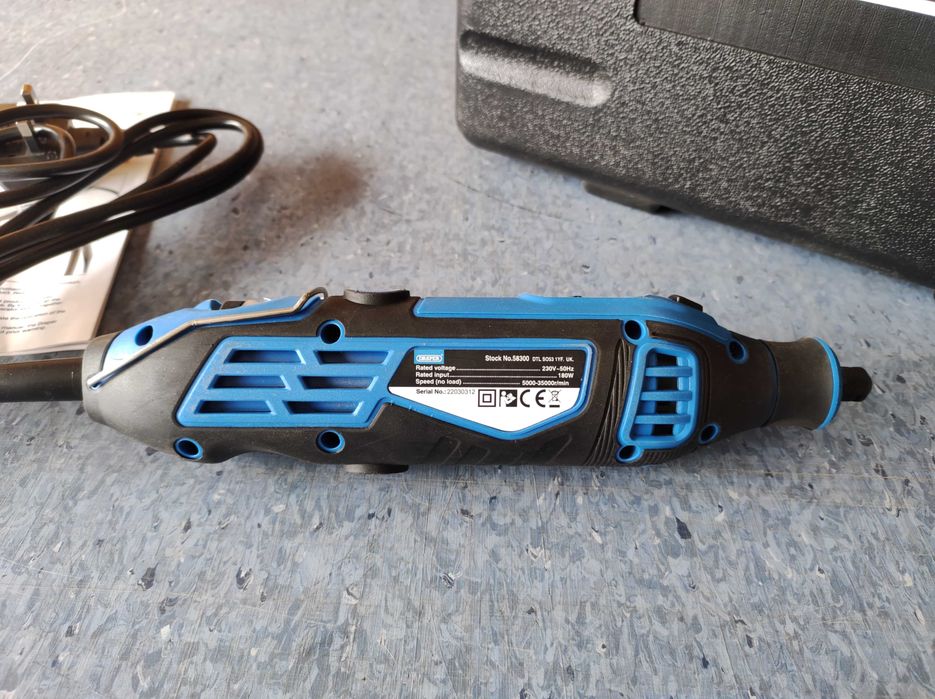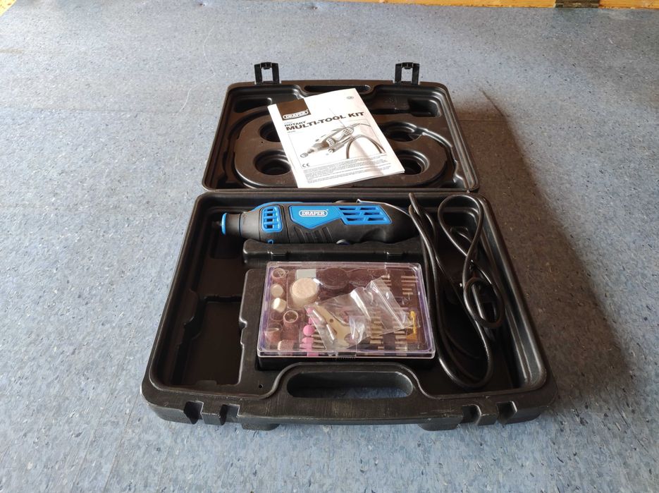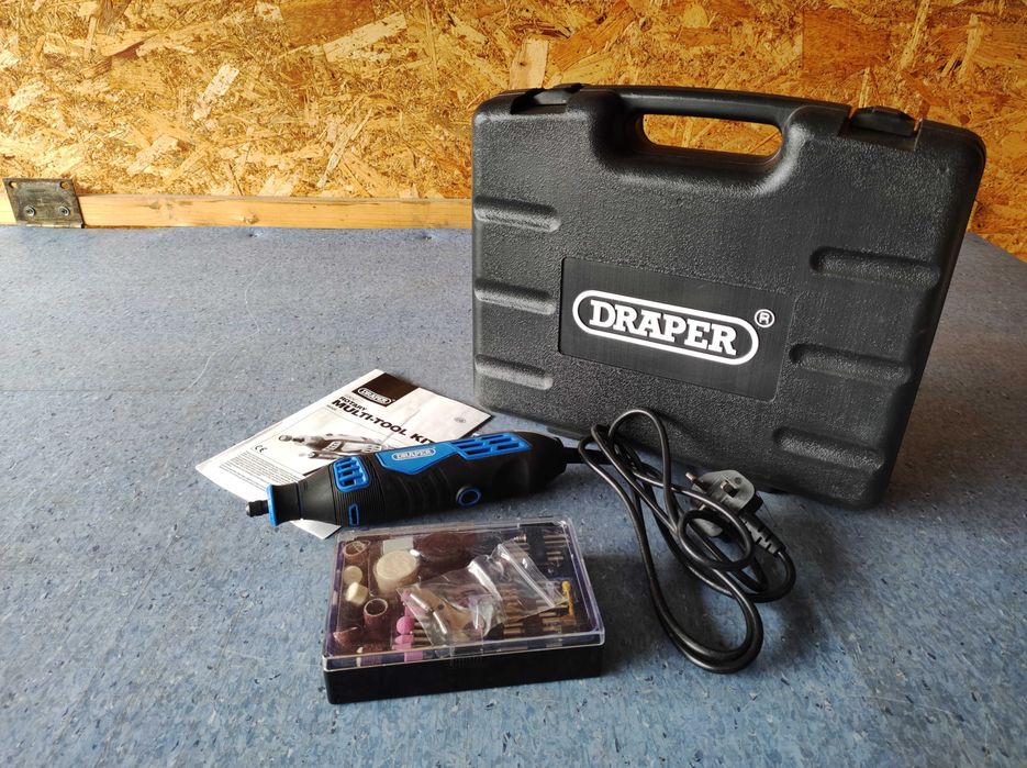 Szlifierka wielofunkcyjna (polerka, mini wiertarka) firmy Draper model 58300 z akcesoriami i walizką. Posiada regulację obrotów od 5000 do 35000 obr./min. Urządzenie posiada wtyczkę sieciową angielską (gratis przejściówka).