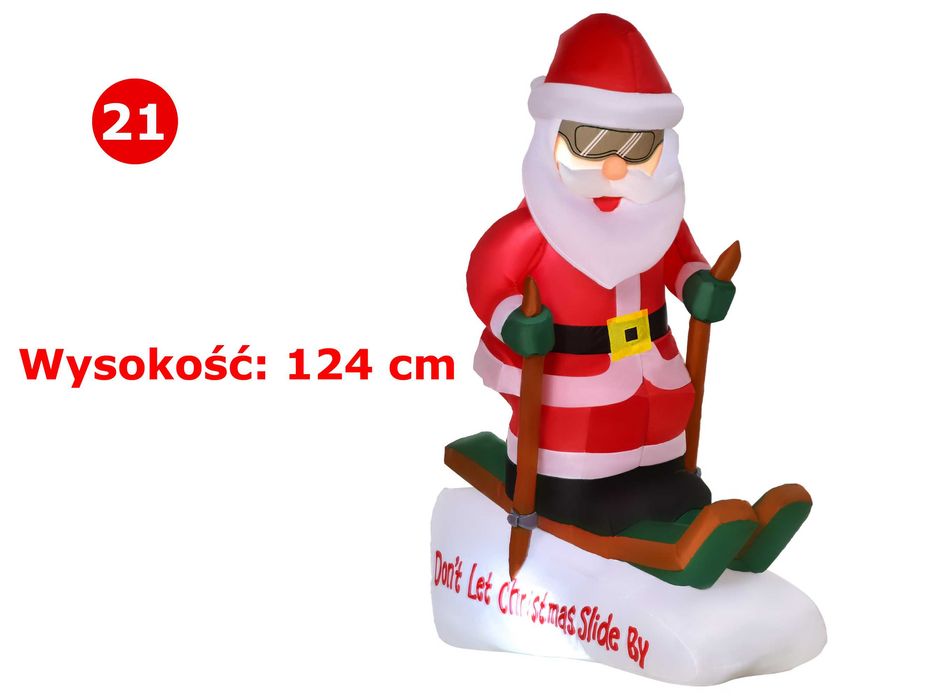 Świąteczna dekoracja do ogródka - dmuchany Mikołaj na nartach. Wysokość ozdoby wynosi 124 cm, od środka jest oświetlona białymi lampkami LED. Ozdoba jest wykonana z przewiewnego materiału, dlatego musi być cały czas podłączona do zasilania, posiada wbudowaną pompkę.