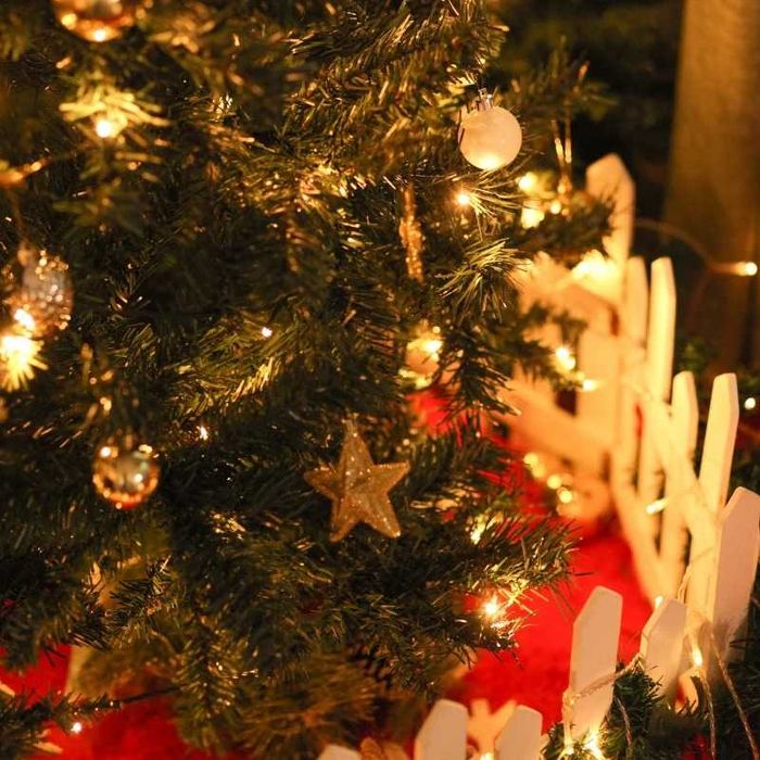 Sztuczna choinka z wbudowanym oświetleniem LED, ozdobiona białymi, złotymi i srebrnymi bombkami. Choinka posiada nastrojowe oświetlenie w kolorze ciepłym białym. Wysokość choinki wynosi 150 cm.