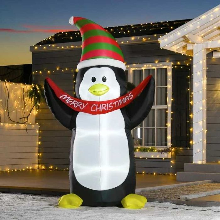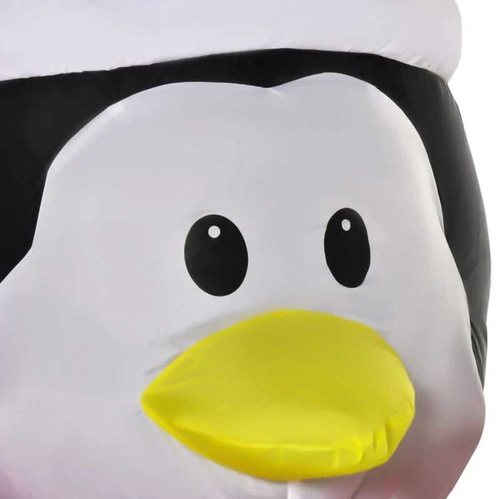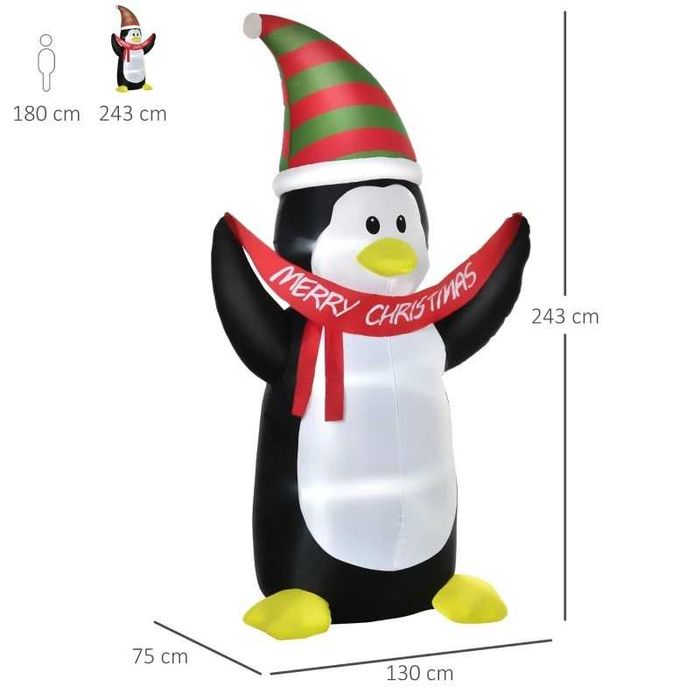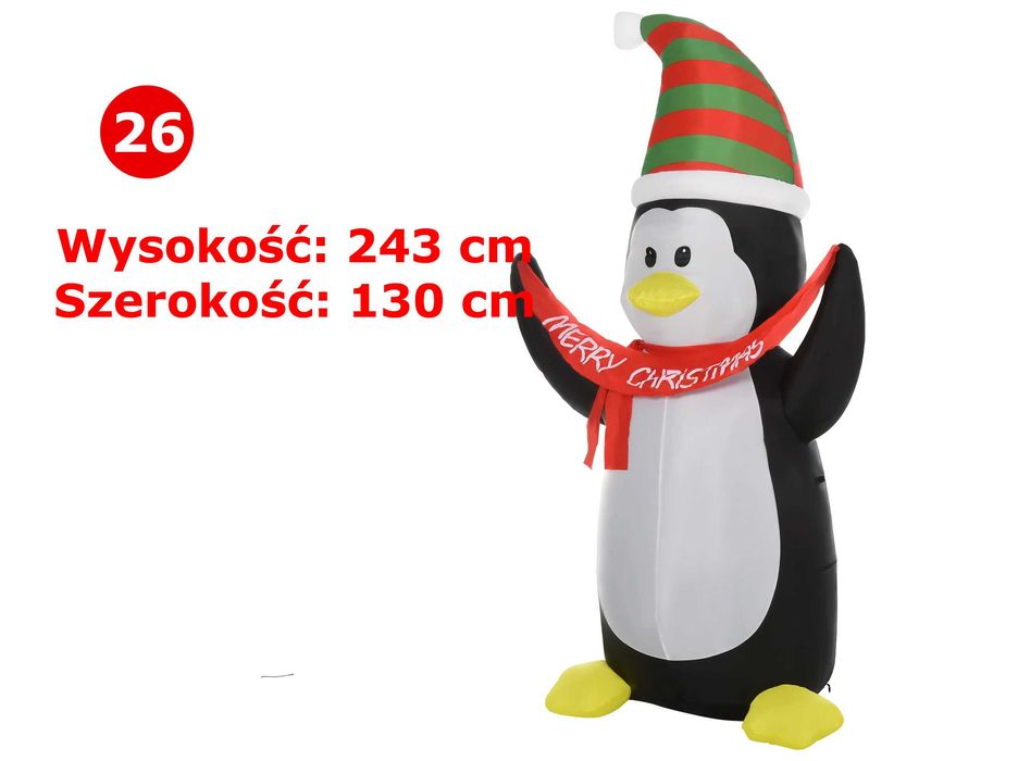 Świąteczna dekoracja do ogródka - dmuchany Pingwin z szalikiem. Wysokość ozdoby wynosi 243 cm, od środka jest oświetlona białymi lampkami LED. Ozdoba jest wykonana z przewiewnego materiału, dlatego musi być cały czas podłączona do zasilania, posiada wbudowaną pompkę.