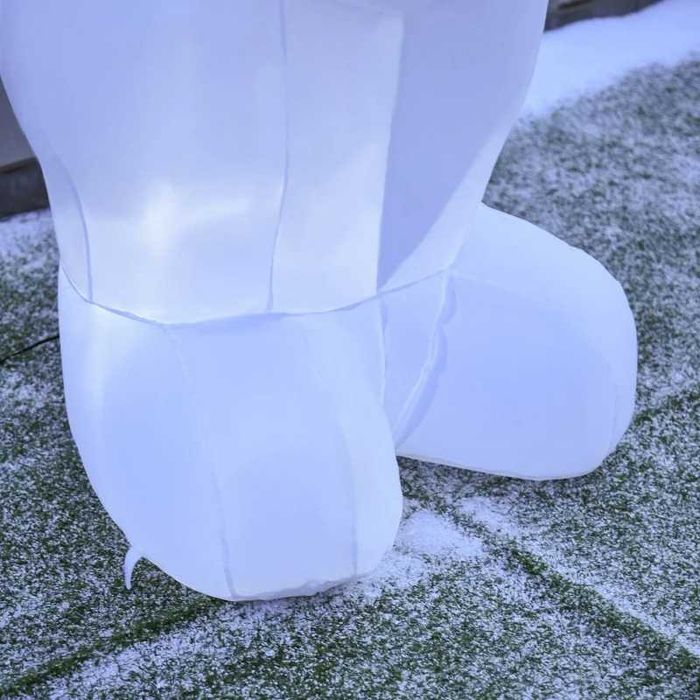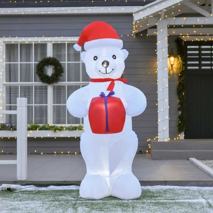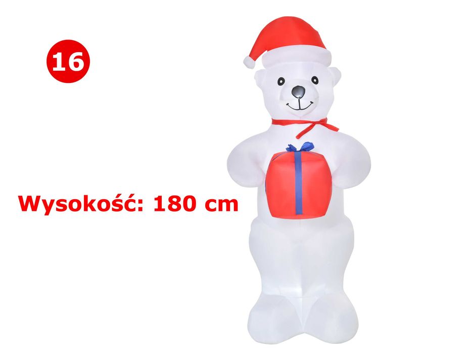 Świąteczna dekoracja do ogródka - dmuchany Niedźwiedź z prezentem. Wysokość ozdoby wynosi 180 cm, od środka jest oświetlona białymi lampkami LED. Ozdoba jest wykonana z przewiewnego materiału, dlatego musi być cały czas podłączona do zasilania, posiada wbudowaną pompkę.