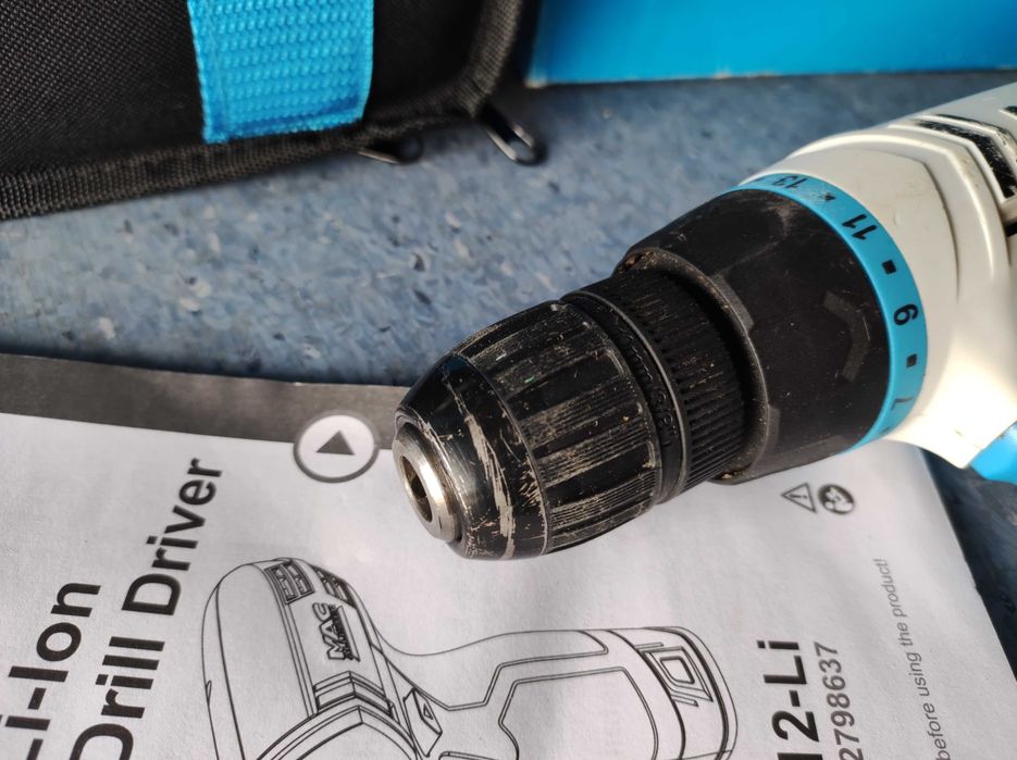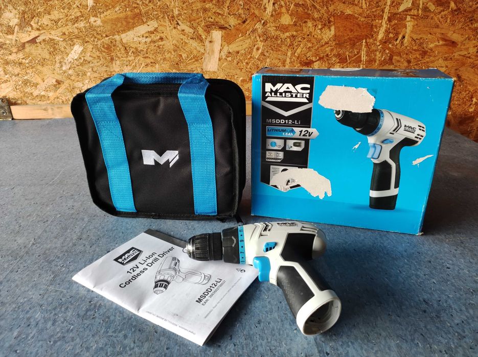 Wkrętarka akumulatorowa firmy Macallister model MSDD12-Li w zestawie z torbą transportową. Urządzenie sprzedawane bez akumulatora i ładowarki (body).