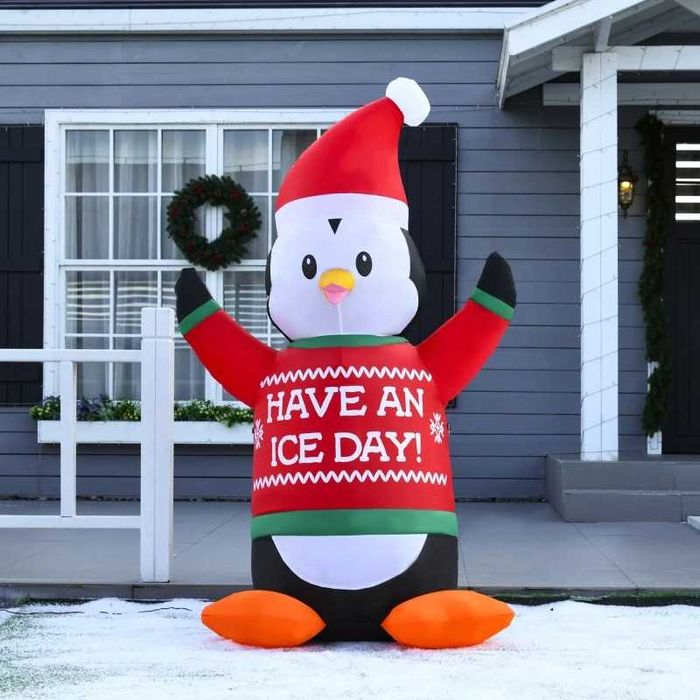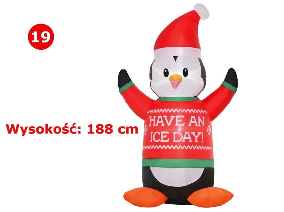 Świąteczna dekoracja do ogródka - dmuchany Pingwin w sweterku. Wysokość ozdoby wynosi 188 cm, od środka jest oświetlona białymi lampkami LED. Ozdoba jest wykonana z przewiewnego materiału, dlatego musi być cały czas podłączona do zasilania, posiada wbudowaną pompkę.