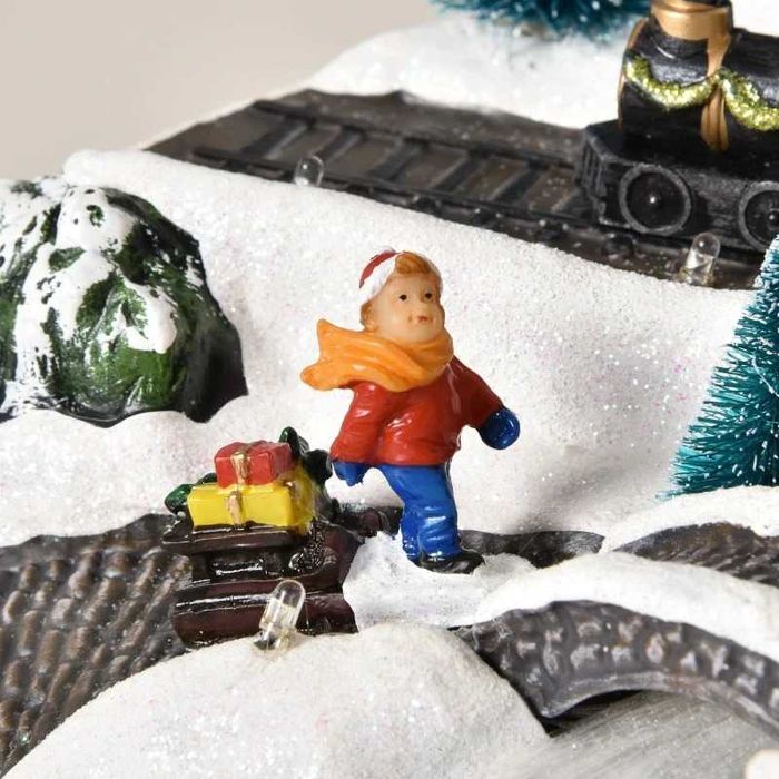 Dekoracja w formie Wioski Świętego Mikołaja. Ozdoba posiada ruchome elementy - pociąg chowa się i wyjeżdża z tunelu oraz jedna z choinek obraca się. Wioska jest ładnie podświetlona kolorowymi lampkami LED. Ozdoba zasilana jest na baterie 3x AA (standardowe paluszki), ma wbudowane kilka świątecznych melodii (posiada możliwość włączenia bez odtwarzania piosenek).