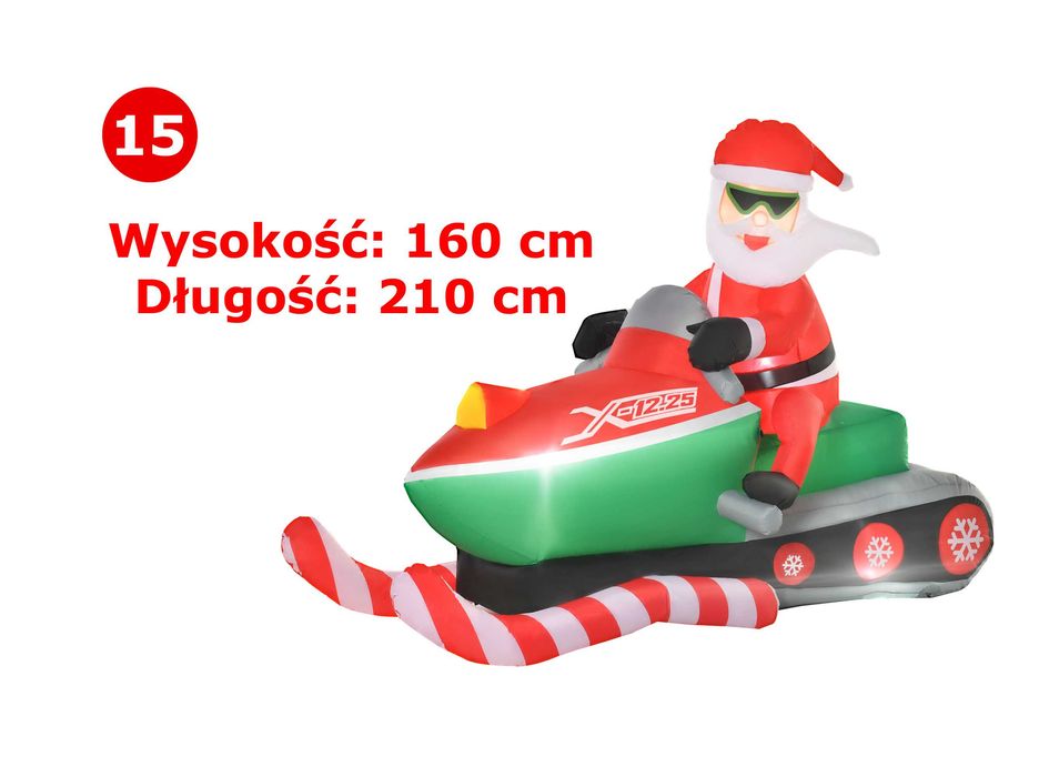 Świąteczna dekoracja do ogródka - dmuchany Mikołaj na skuterze śnieżnym. Wysokość ozdoby wynosi 160 cm, od środka jest oświetlona białymi lampkami LED. Ozdoba jest wykonana z przewiewnego materiału, dlatego musi być cały czas podłączona do zasilania, posiada wbudowaną pompkę.